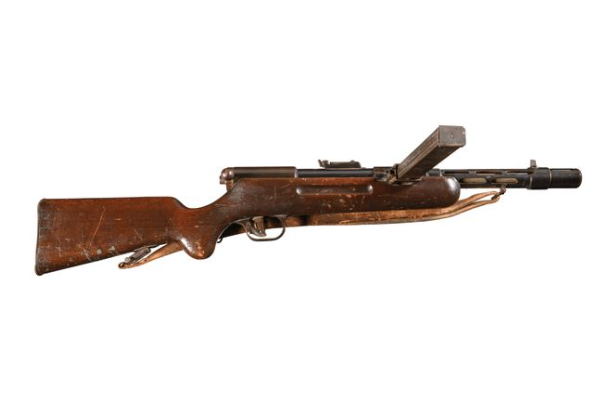 Developed by Bergmann in the early 1930s, the MP35/I is a fine example of the type of heavily machined, wood stocked submachine gun that was the state of the art manufacturing prior to the introduction of the stamped sheet metal guns. It is an open bolt, blow-back weapon that uses a “bolt action” type non-reciprocating cocking piece to initially load the weapon. Similar to some early German semi-auto military rifles, the charging handle locks down and to the right when firing, and to charge the user lifts up, pulls back, and returns the handle, with the bolt locking in the open position in the process. A dual action trigger mechanism is at work; with the finger high on the trigger the weapon fires in semi-automatic, but placing the finger low also engages a sear catch that disengages the disconnector and produces full automatic fire. Two safeties are installed on the left side of the receiver, one locking the bolt in the closed position as a drop safety, the other disabling the trigger, both marked “F” and “S” in the proper locations. The left side of the receiver bears the model nomenclature and serial number, along with a highly desirable “eagle/SSZZA1” SS proof and “JR” monogram; the JR mark is associated with the firm Junkers & Rue, a supplier of SMGs to the SS. Blade front sight, tangent rear sight, and smooth hardwood stock with forearm grasping grooves, steel buttplate, and a brown leather sling.
